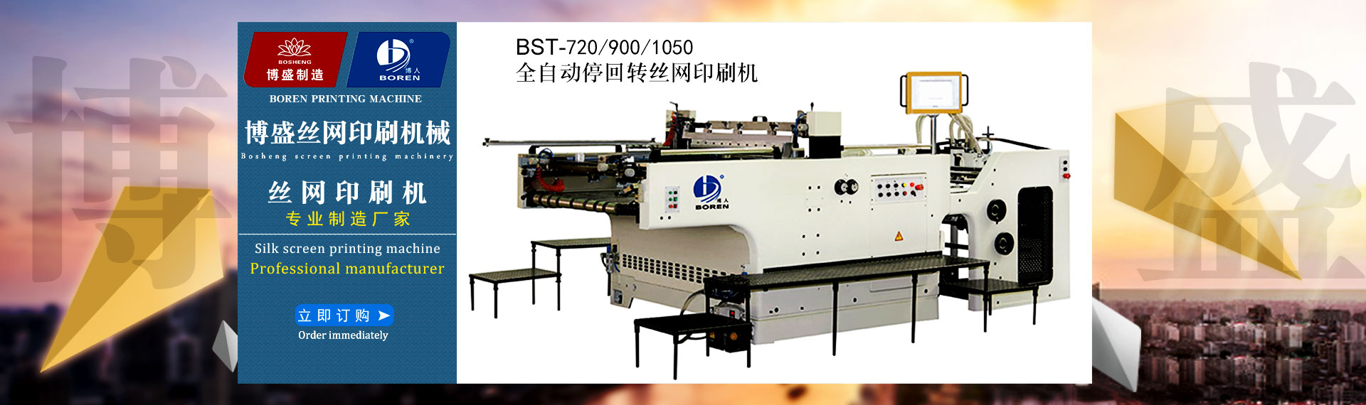 瑞安市博盛絲網(wǎng)印刷機械廠是一家專業(yè)集生產(chǎn)加工,經(jīng)營批發(fā)的私營獨資企業(yè)。制造各類全自動絲網(wǎng)印刷機、卷對卷全自動(無紡布)網(wǎng)印機、全自動卷筒式網(wǎng)印橫切一體機、半自動平升式、斜臂式微電腦控制精密網(wǎng)印機、紫外線(UV)光固機、絲印真空曬版機、烘版機、熱風(fēng)烤(烘)箱、組合式(IR)紅外線烘道、機械式精密... 查看詳情>>